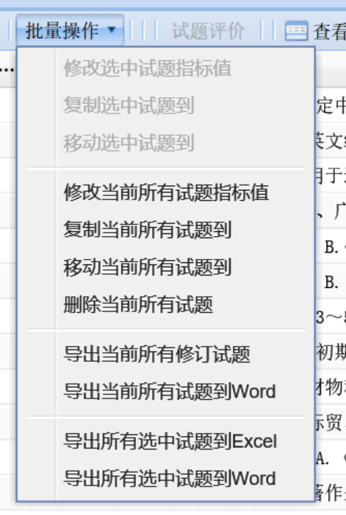 “批量操作”:可以批量删除试题,批量修改试题的章节,或分值。可以导出试题。