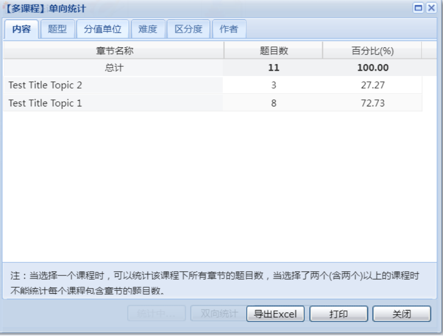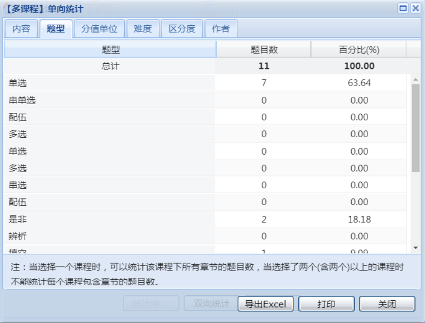 点击导航菜单红的 试题统计”,选择课程可以统计课程中的题目数量