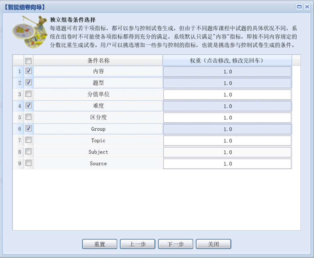 第四步:选择各种指标条件进行试题筛选,选中的指标条件将在下一步中体现,以供用户操作: