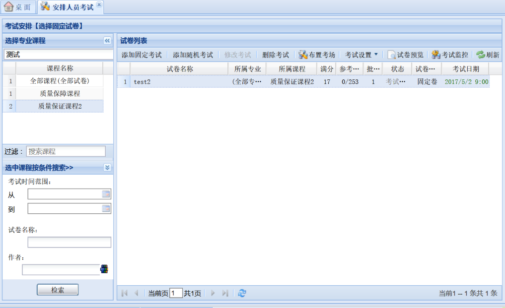考试安排的功能区划分为左右两栏,左边为考试搜索去,上部分按专业课程搜索,下半部分按考试时间,试卷名称,作者搜索考试。